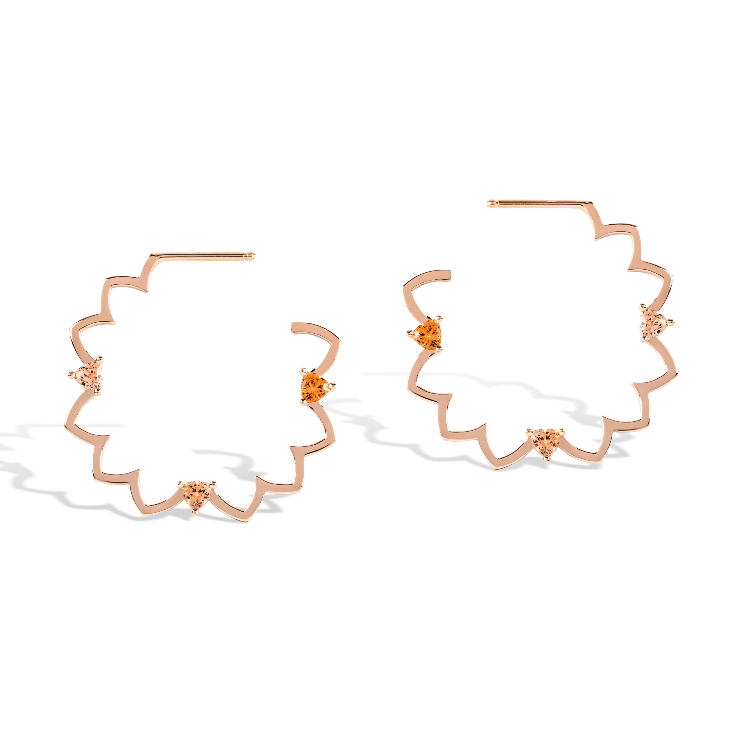 The Stars earrings are set with orange and yellow trillion-cut sapphires interpreting the most beautiful sunrises from tropical countries. The jewellery piece set with rose gold, which enhances the warm shades from the colored stones.